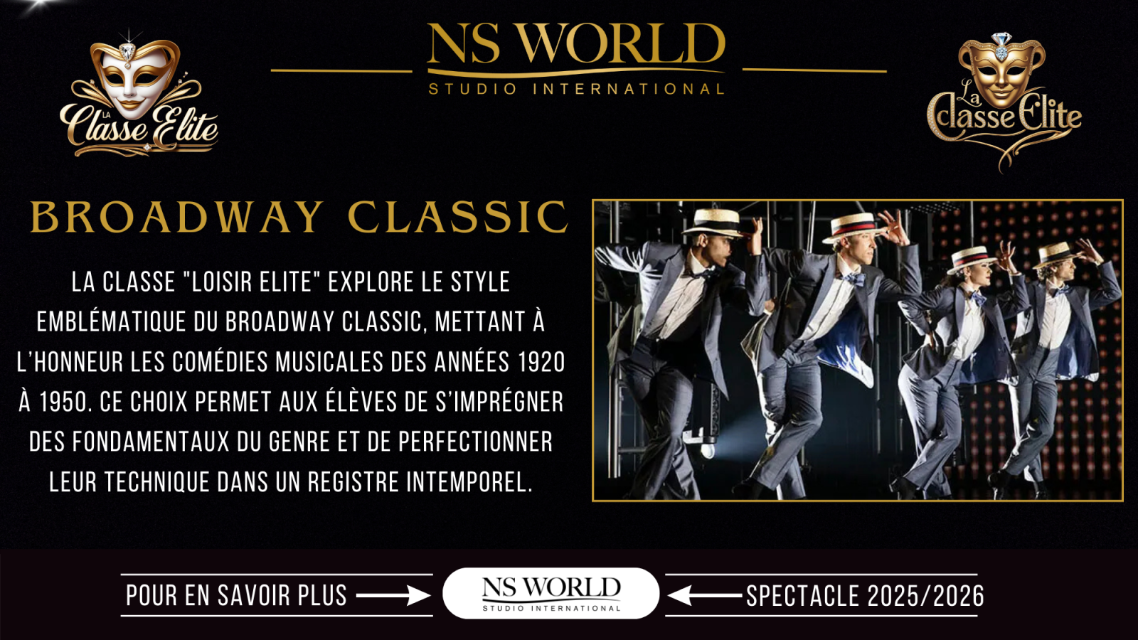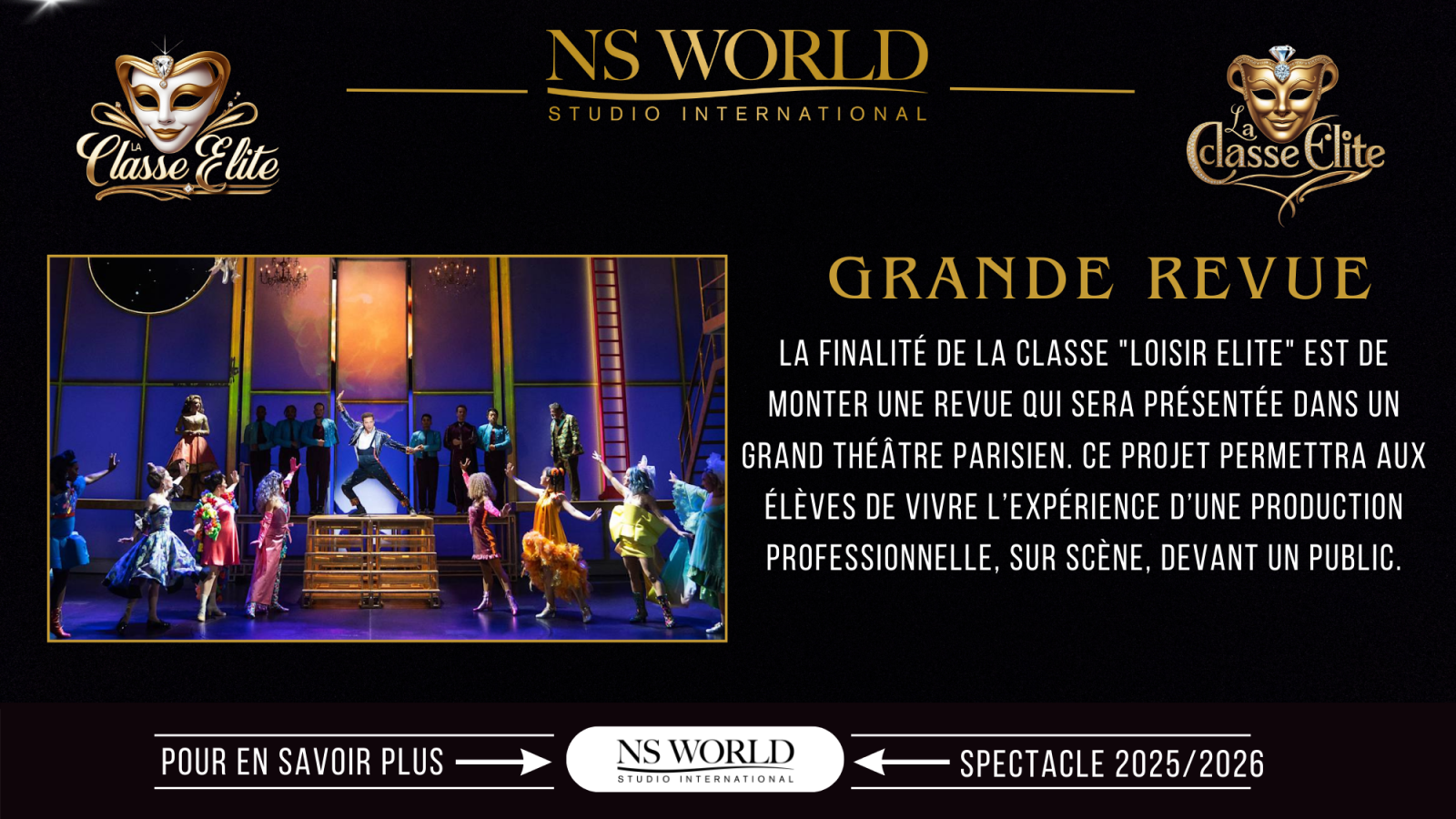 Tout au long de l’année, les élèves participent à la création d’une revue musicale inspirée des grandes productions de Broadway, mêlant classicisme, précision chorégraphique et exigence vocale. Le spectacle final est présenté dans un cadre professionnel, valorisant le travail de troupe, l’expression scénique et la rigueur artistique.