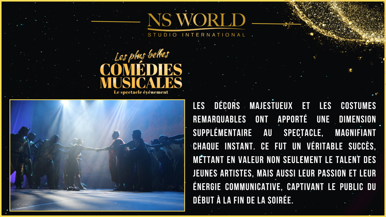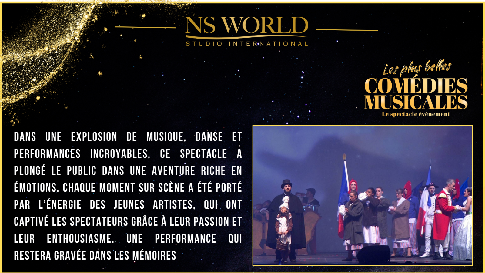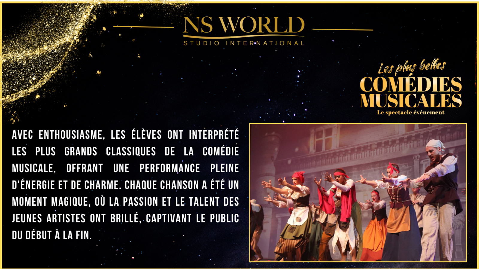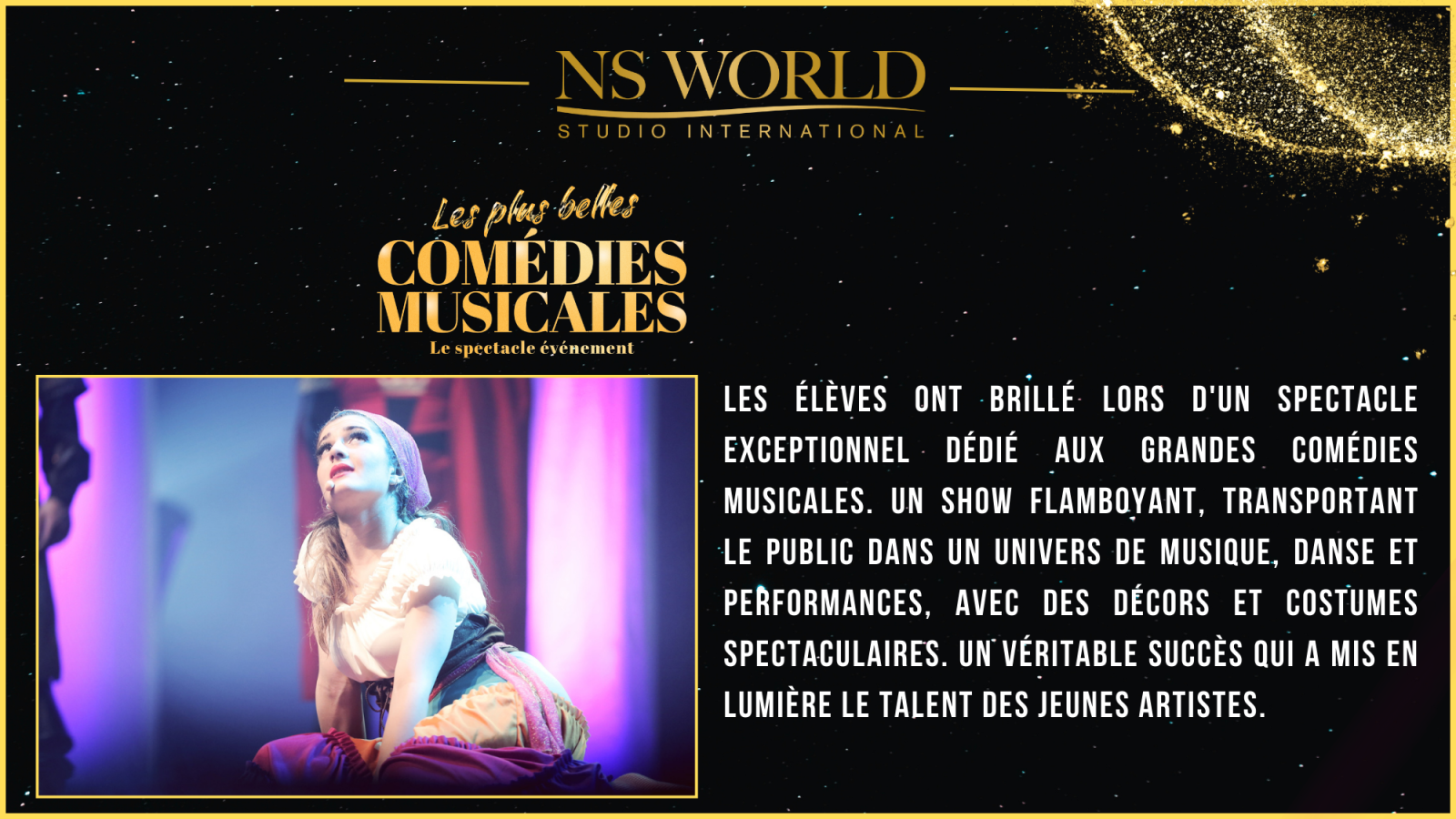 Le spectacle "Les Plus Belles Comédies Musicales" met à l’honneur les plus grands titres du répertoire musical, dans une succession de tableaux chantés, dansés et joués par les élèves en comédie musicale du NS WORLD STUDIO INTERNATIONAL. Ce show, à la fois festif et exigeant, permet à chaque artiste de démontrer l’étendue de son travail et de ses acquis.