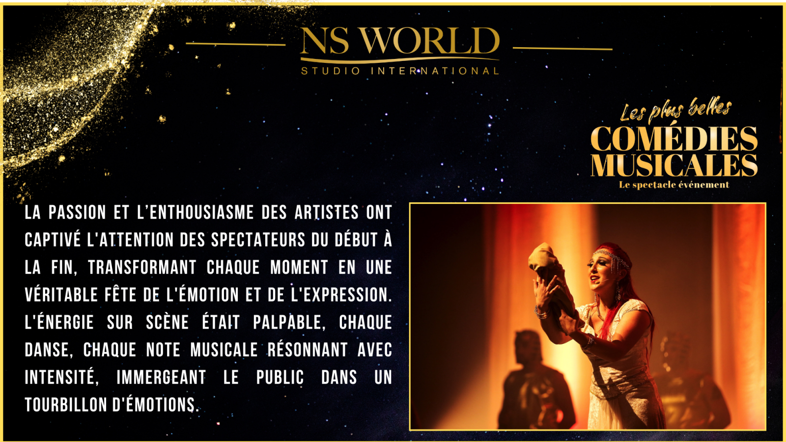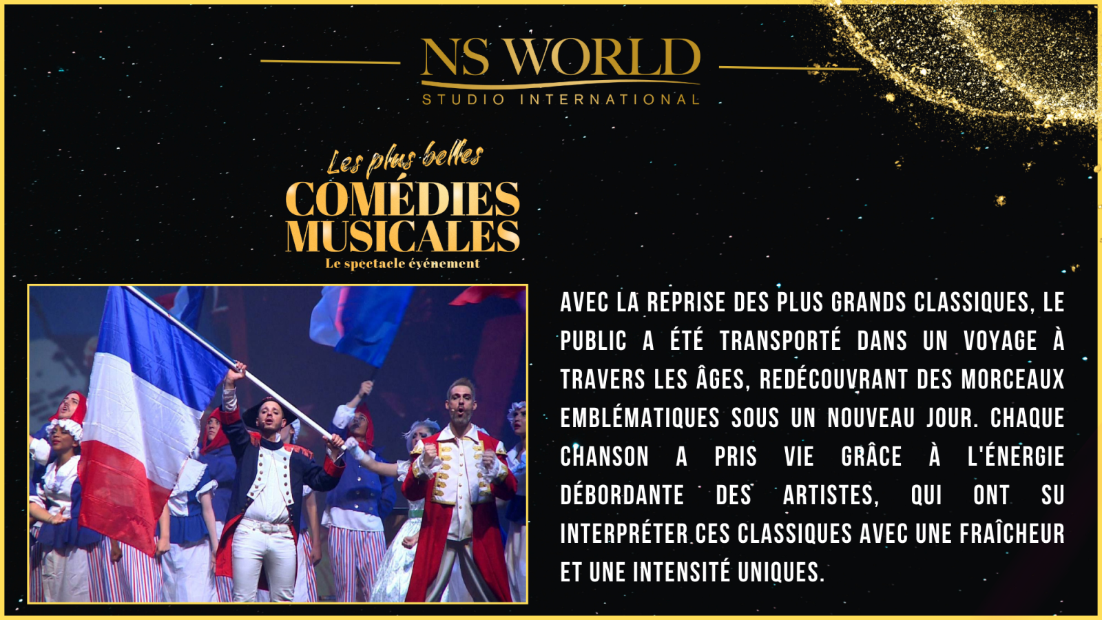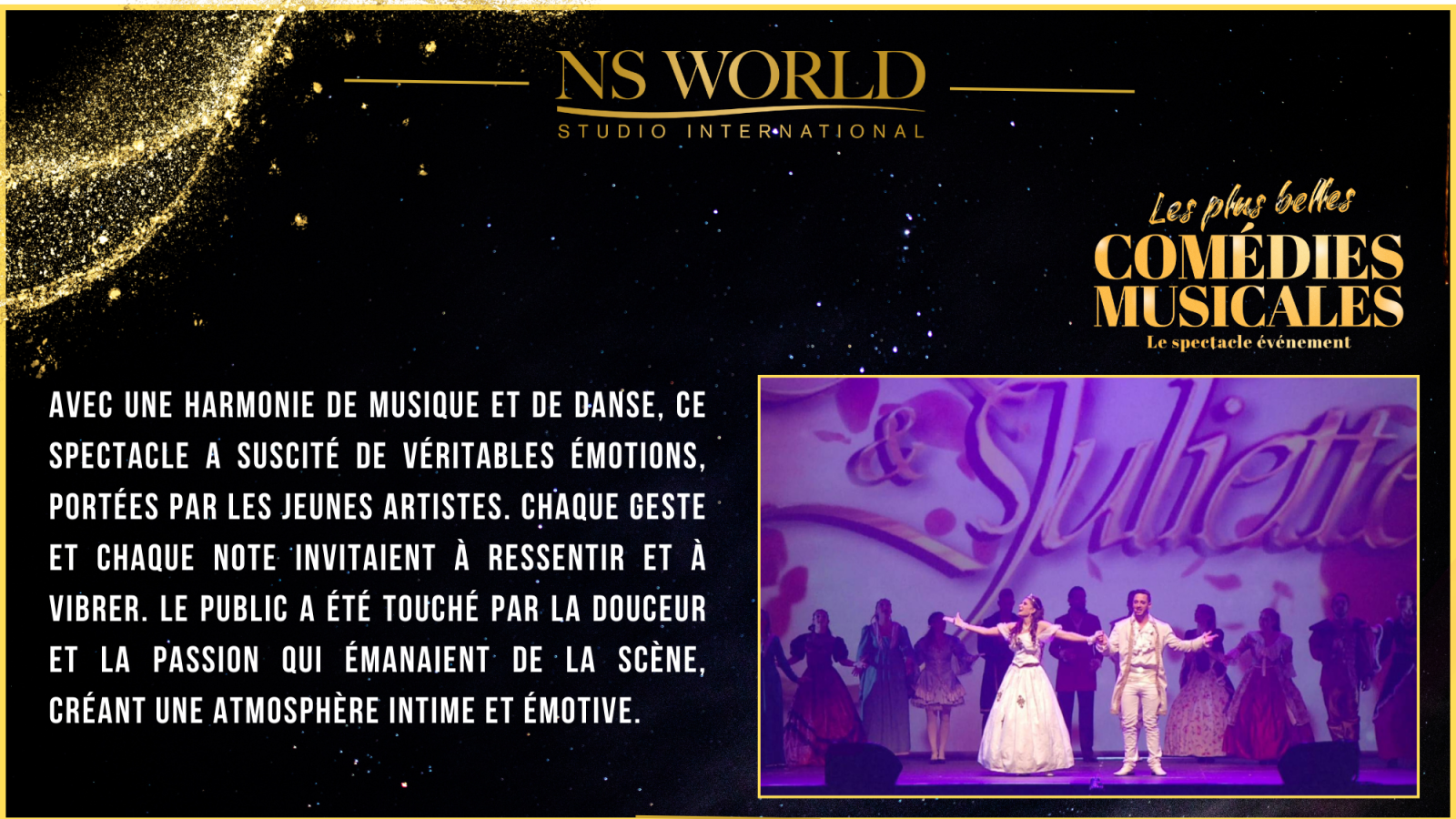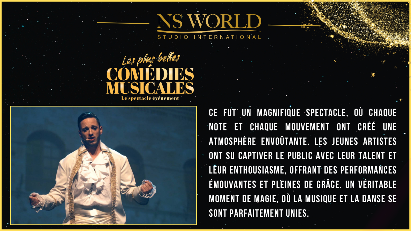 Le spectacle "Les Plus Belles Comédies Musicales" met à l’honneur les plus grands titres du répertoire musical, dans une succession de tableaux chantés, dansés et joués par les élèves en comédie musicale du NS WORLD STUDIO INTERNATIONAL. Ce show, à la fois festif et exigeant, permet à chaque artiste de démontrer l’étendue de son travail et de ses acquis.